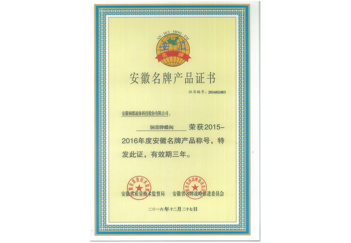 蝶閥-名牌產(chǎn)品證書(shū)