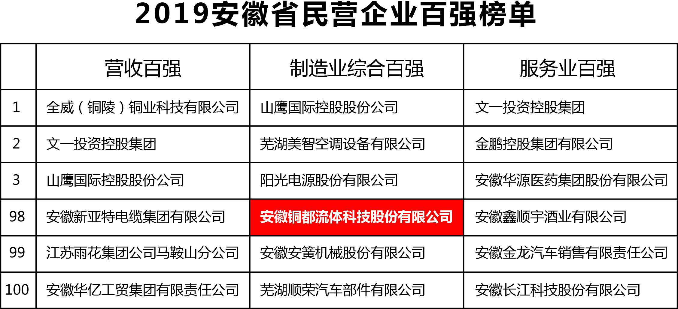 安徽銅都流體科技股份有限公司入圍制造業(yè)綜合百強。