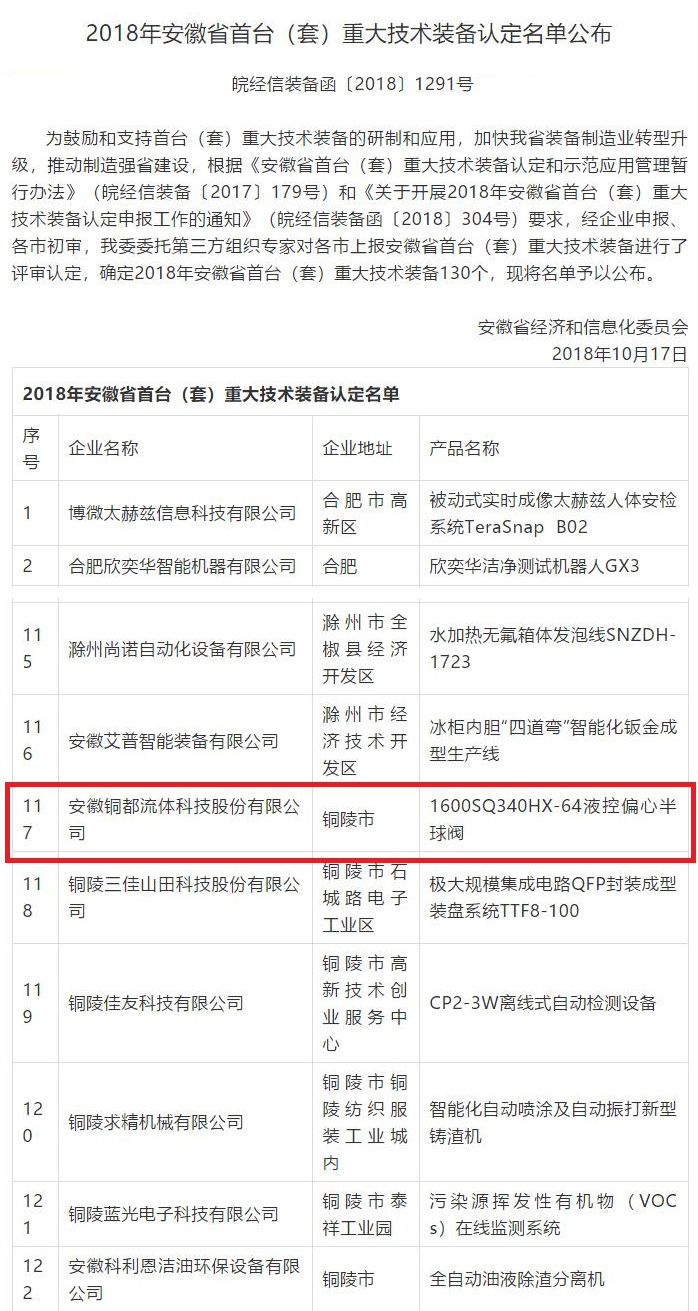 由銅都流體自行研發(fā)的超大口徑、超高壓力DN1600 PN64液控偏心半球閥,經銅陵市初審,第三方專家評審認定,確定為2018年安徽省首臺(套)重大技術裝備。