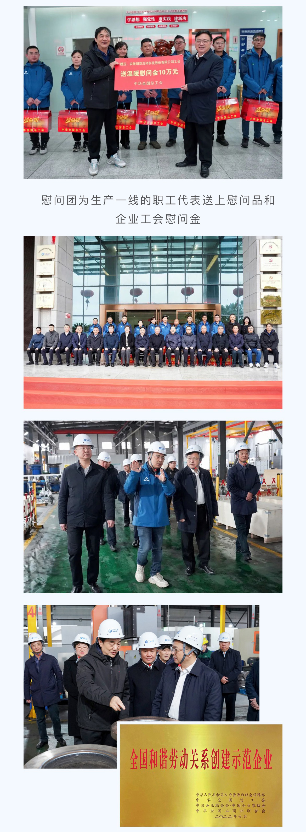 慰問團一行對銅都流體獲得“全國和諧勞動關(guān)系創(chuàng)建示范企業(yè)”榮譽作出充分肯定,并在董事長楊成、總經(jīng)理楊凌杰陪同下,前往生產(chǎn)現(xiàn)場,看望奮戰(zhàn)在生產(chǎn)一線的職工代表,為他們送上慰問品和企業(yè)工會慰問金,詳細(xì)了解企業(yè)生產(chǎn)經(jīng)營和工會工作情況,指出企業(yè)工會組織要切實發(fā)揮作用,圍繞企業(yè)生產(chǎn),積極開展各類勞動競賽和技能素質(zhì)提升活動,為職工的成長成才搭建廣闊舞臺,鼓勵廣大職工要充分發(fā)揮工人階級主力軍作用,用辛勤的勞動創(chuàng)造美好的生活,為推進(jìn)中國式現(xiàn)代化貢獻(xiàn)自己的力量。