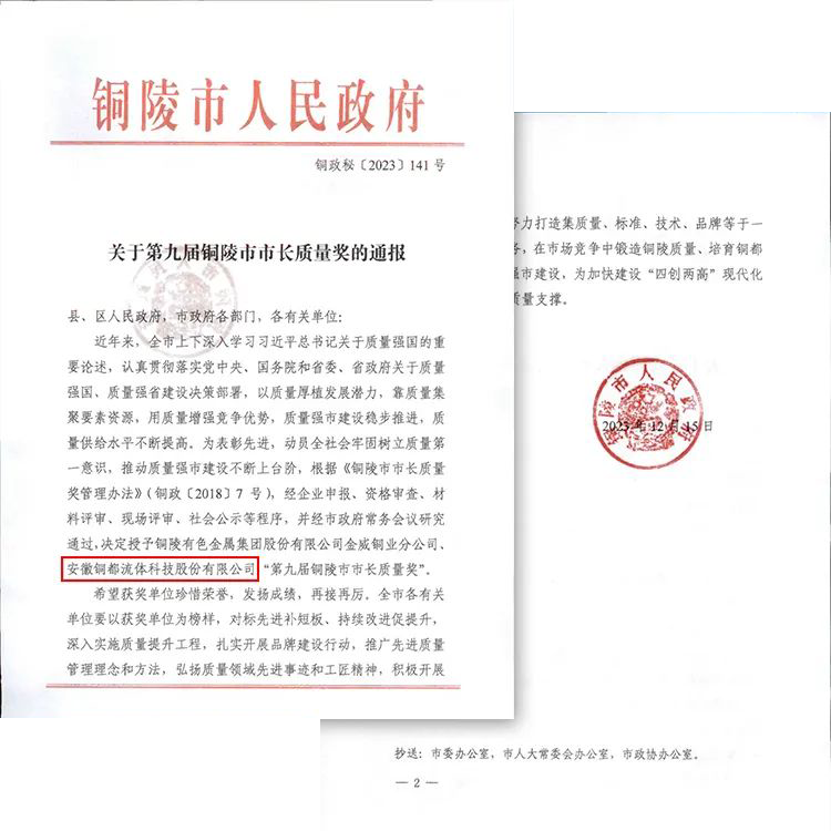 日前,安徽銅都流體科技股份有限公司榮獲第九屆銅陵市市長質(zhì)量獎(jiǎng)。
