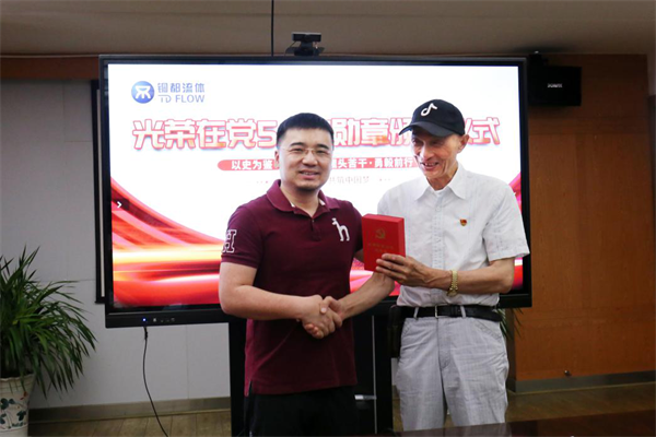 在熱烈的掌聲中,黨委書記楊凌杰為“光榮在黨50年”老同志鄭征途頒發(fā)紀(jì)念勛章,老同志激動萬分,感恩黨和國家,永遠聽黨話,跟黨走。
