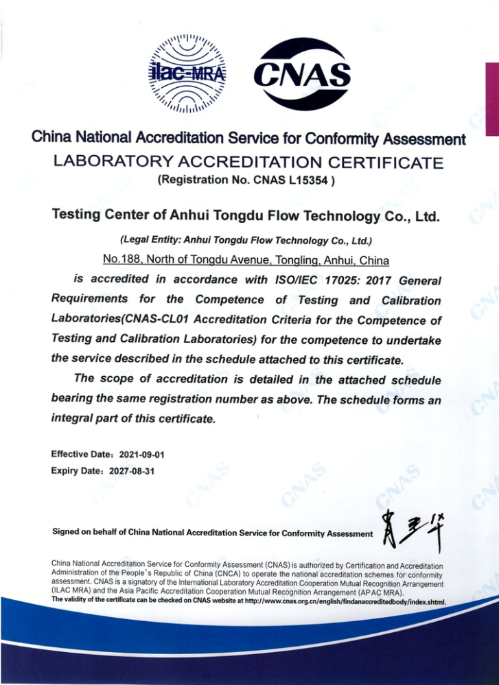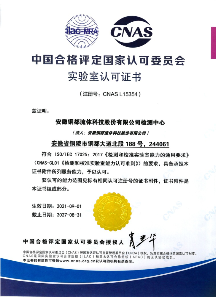 安徽銅都流體科技股份有限公司于近日獲得“中國合格評定國家認(rèn)可委員會(CNAS)實(shí)驗(yàn)室認(rèn)可證書”。